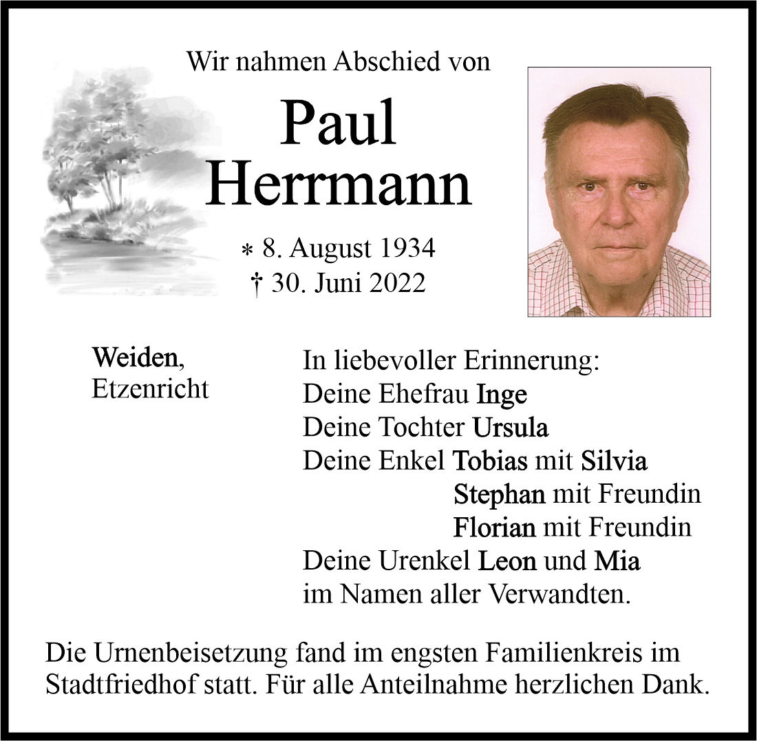 Traueranzeige Paul Herrmann, Weiden 20. Juli 2022, 06:00 Uhr Von: redaktion Traueranzeige Paul Herrmann, Weiden Landkreis Neustadt/WN Etzenricht Stadtgebiete Weiden Weiden Stadt