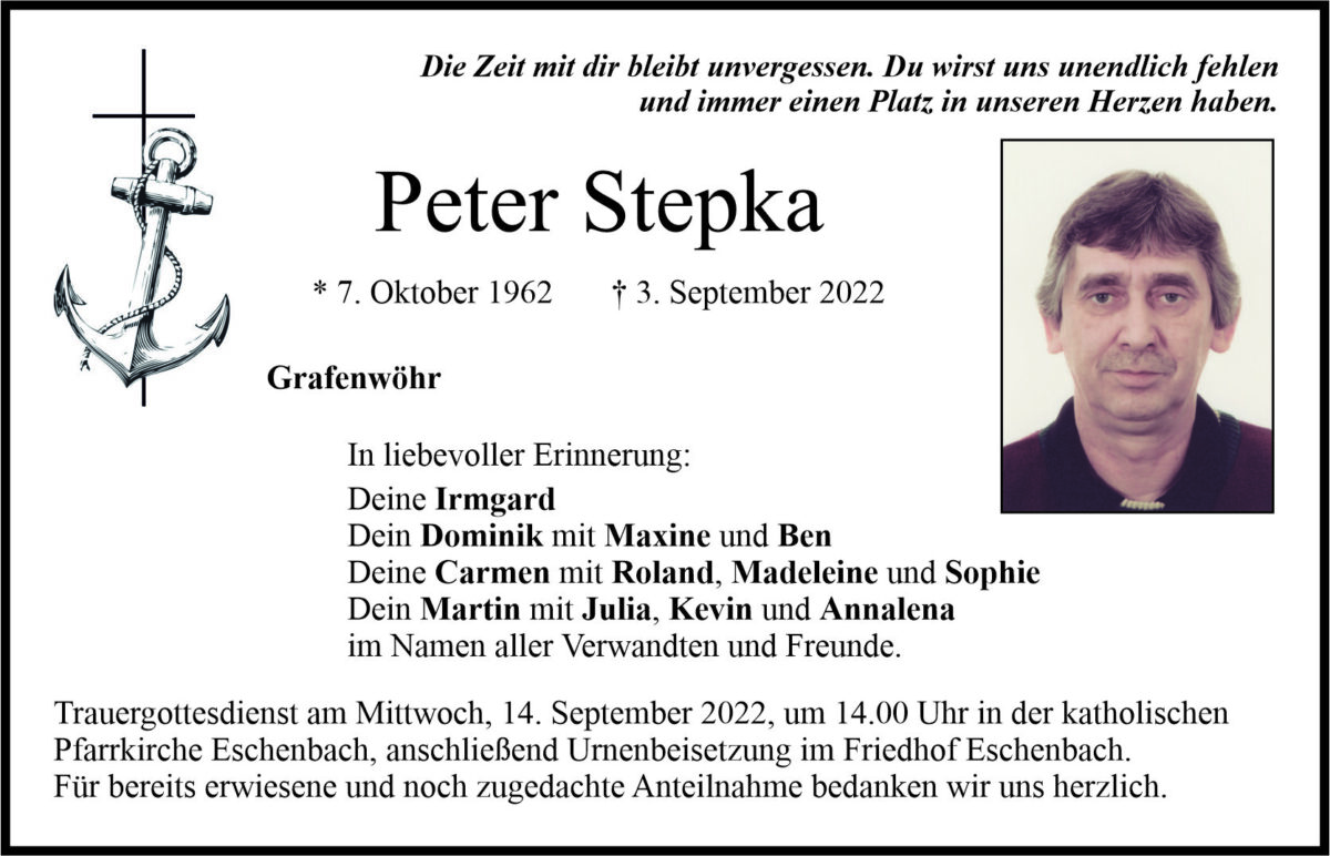 Traueranzeige Peter Stepka, Grafenwöhr 09. September 2022, 06:00 Uhr Von: redaktion Traueranzeige Peter Stepka, Grafenwöhr Landkreis Neustadt/WN Eschenbach Grafenwöhr