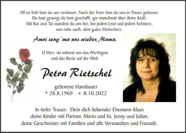 Traueranzeige Petra Rietschel 11. Oktober 2022, 06:00 Uhr Von: redaktion Traueranzeige Petra Rietschel Stadtgebiete Weiden Weiden Stadt