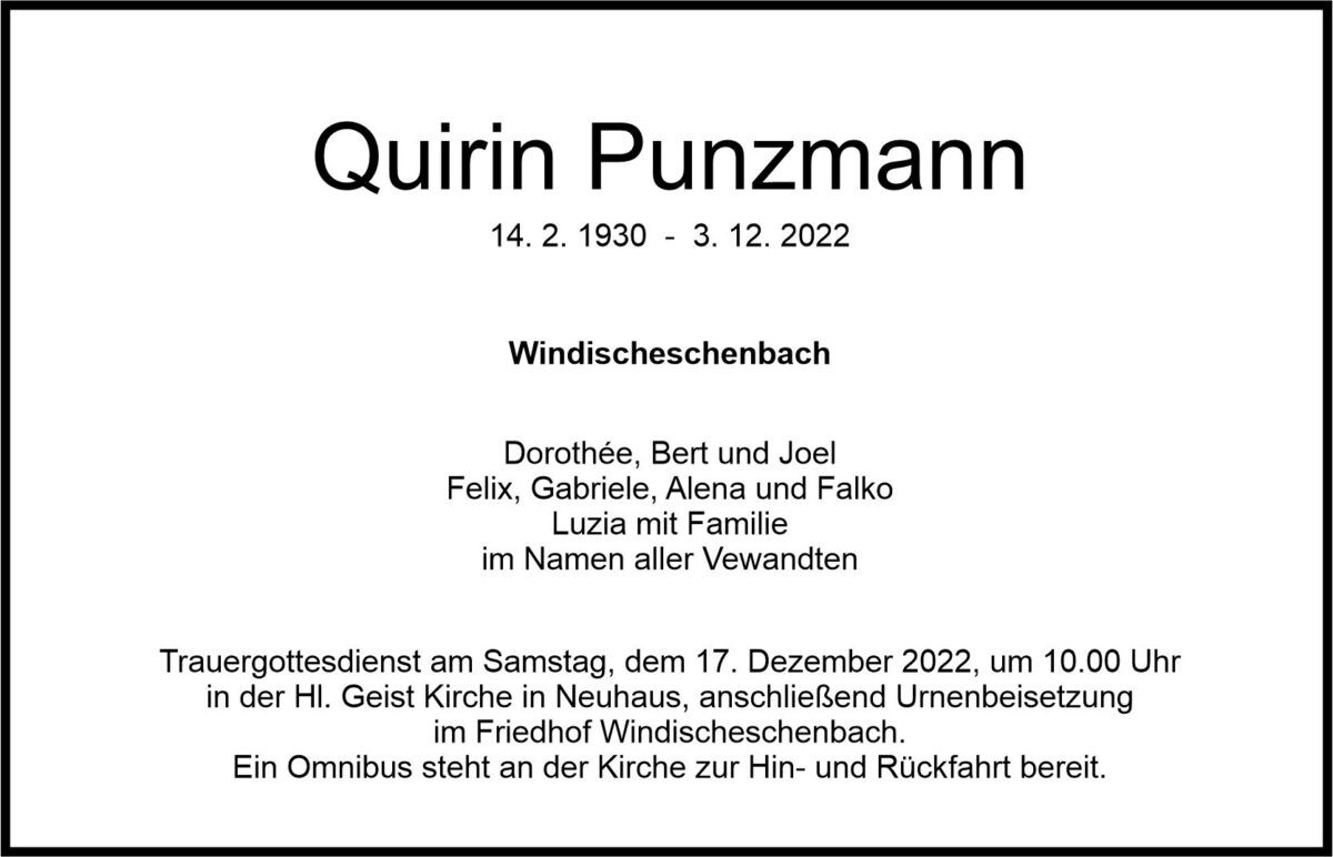 Traueranzeige Quirin Punzmann, Windischeschenbach 14. Dezember 2022, 06:00 Uhr Von: redaktion Traueranzeige Quirin Punzmann, Windischeschenbach Landkreis Neustadt/WN Windischeschenbach