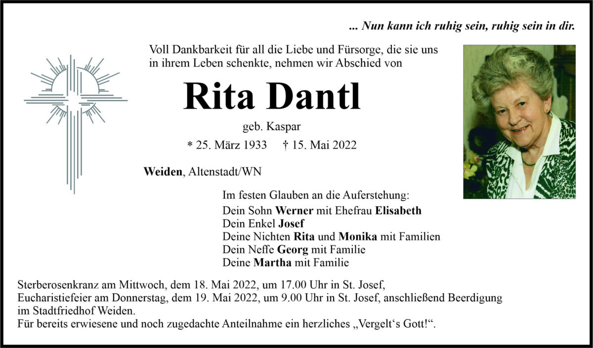 Traueranzeige Rita Dantl, Weiden 17. Mai 2022, 06:00 Uhr Von: redaktion Traueranzeige Rita Dantl, Weiden Landkreis Neustadt/WN Altenstadt/WN Stadtgebiete Weiden Weiden Stadt