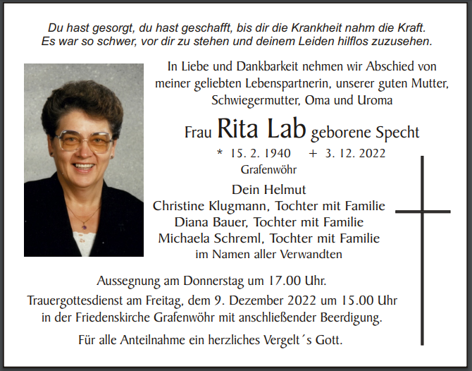 Traueranzeige Rita Lab, Grafenwöhr 06. Dezember 2022, 06:00 Uhr Von: redaktion Traueranzeige Rita Lab, Grafenwöhr Landkreis Neustadt/WN Grafenwöhr