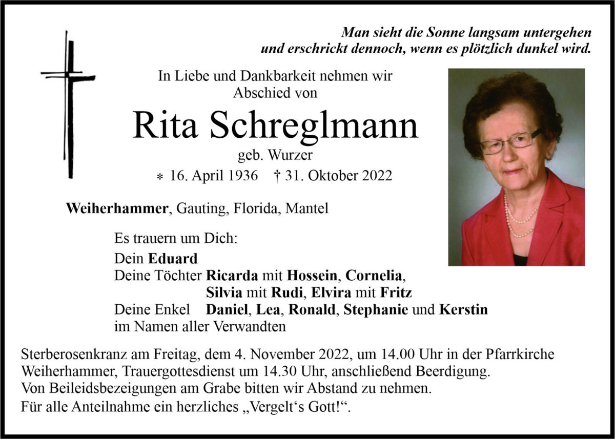 Traueranzeige Rita Schreglmann, Weiherhammer 03. November 2022, 06:00 Uhr Von: redaktion Traueranzeige Rita Schreglmann, Weiherhammer Landkreis Neustadt/WN Mantel Weiherhammer
