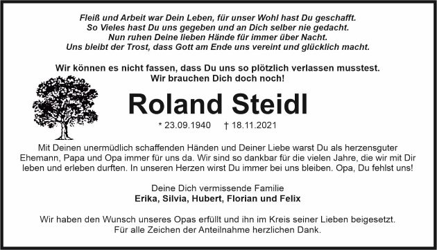 Traueranzeige Roland Steidl, Weiden 01. Dezember 2021, 05:00 Uhr Von: redaktion Traueranzeige Roland Steidl, Weiden Stadtgebiete Weiden Weiden Stadt