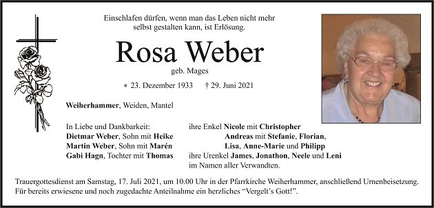 Traueranzeige Rosa Weber, Weiherhammer 15. Juli 2021, 04:00 Uhr Von: redaktion Traueranzeige Rosa Weber, Weiherhammer Landkreis Neustadt/WN Mantel Weiherhammer Stadtgebiete Weiden Weiden Stadt