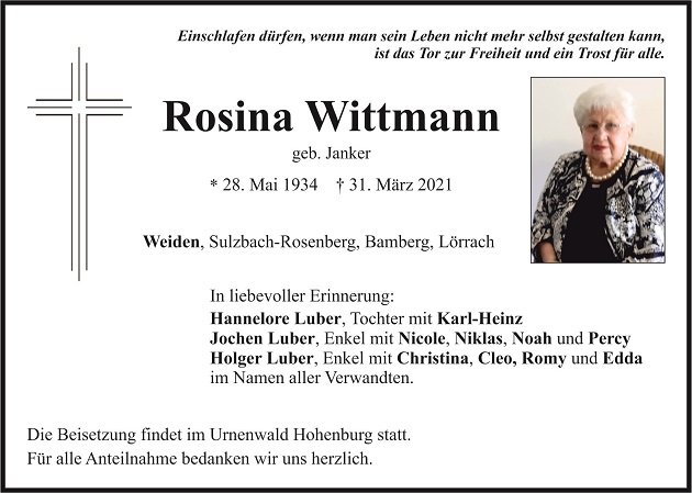 Traueranzeige Rosina Wittmann, Weiden 09. April 2021, 04:00 Uhr Von: redaktion Traueranzeige Rosina Wittmann, Weiden Stadtgebiete Weiden Weiden Stadt
