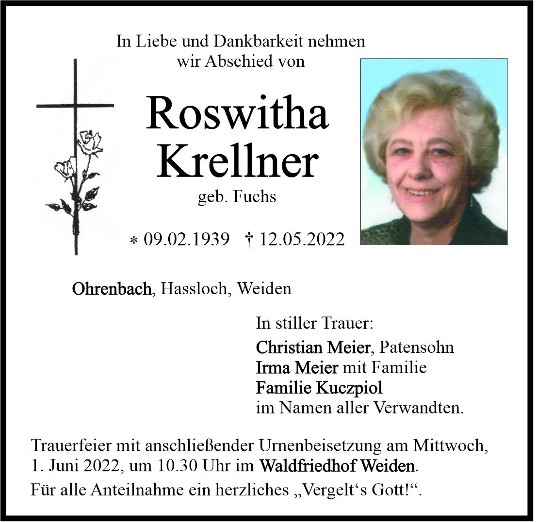 Traueranzeige Roswitha Krellner, Ohrenbach 28. Mai 2022, 06:00 Uhr Von: redaktion Traueranzeige Roswitha Krellner, Ohrenbach Stadtgebiete Weiden Weiden Stadt