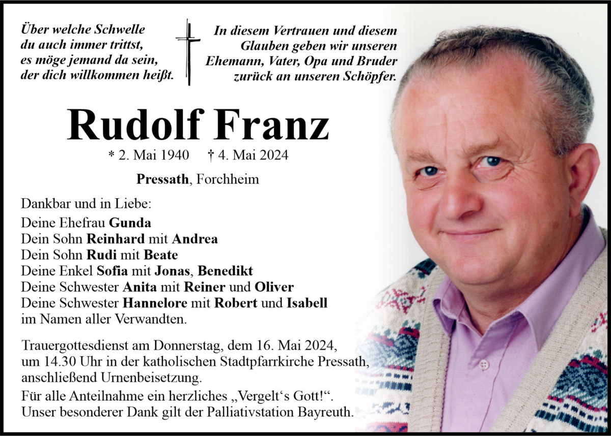 Traueranzeige Rudolf Franz, Pressath 10. Mai 2024, 20:00 Uhr Von: redaktion Begleitet durch: Bestattung Bauer - Weiden Traueranzeige Rudolf Franz, Pressath Landkreis Neustadt/WN Pressath