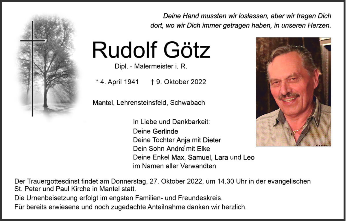 Traueranzeige Rudolf Götz, Mantel 25. Oktober 2022, 06:00 Uhr Von: redaktion Traueranzeige Rudolf Götz, Mantel Landkreis Neustadt/WN Mantel