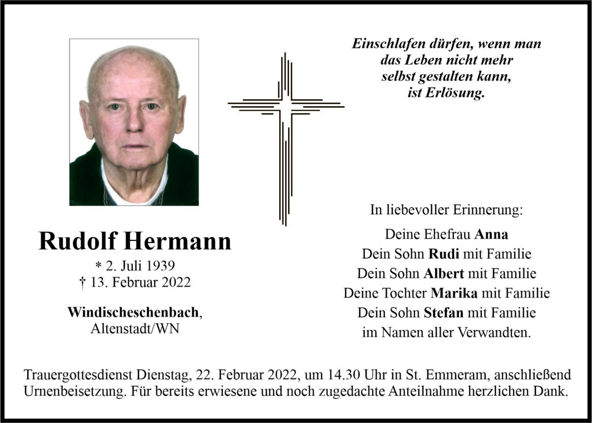 Traueranzeige Rudolf Hermann, Windischeschenbach 19. Februar 2022, 06:00 Uhr Von: redaktion Traueranzeige Rudolf Hermann, Windischeschenbach Landkreis Neustadt/WN Altenstadt/WN Windischeschenbach