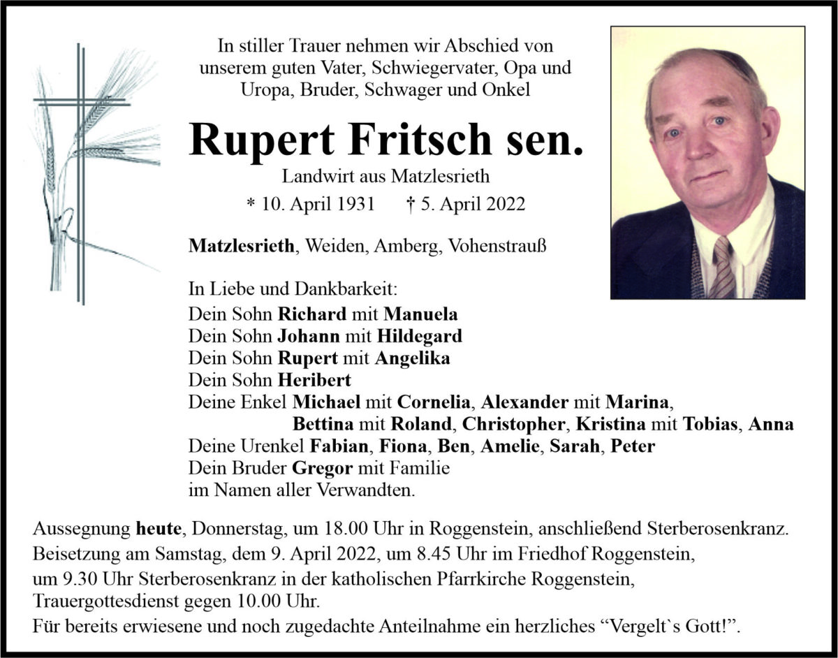 Traueranzeige Rupert Fritsch sen., Matzlesrieth 07. April 2022, 06:00 Uhr Von: redaktion Traueranzeige Rupert Fritsch sen., Matzlesrieth Stadtgebiete Amberg Amberg Stadt Landkreis Neustadt/WN Vohenstrauß Stadtgebiete Weiden Weiden Stadt