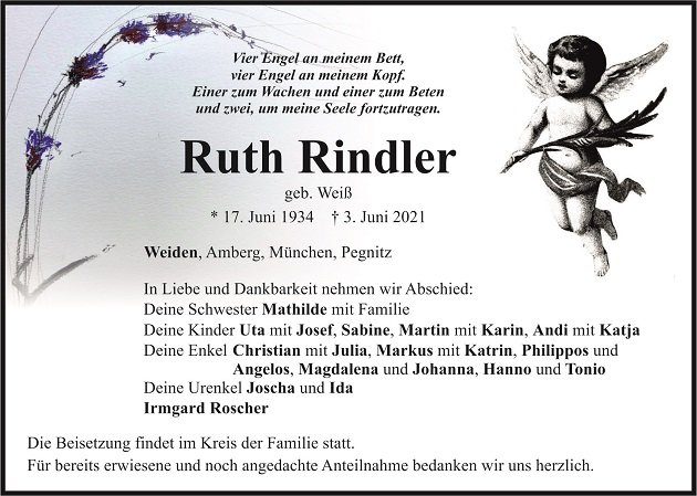 Traueranzeige Ruth Rindler, Weiden 09. Juni 2021, 04:00 Uhr Von: redaktion Traueranzeige Ruth Rindler, Weiden Stadtgebiete Amberg Amberg Stadt Stadtgebiete Weiden Weiden Stadt