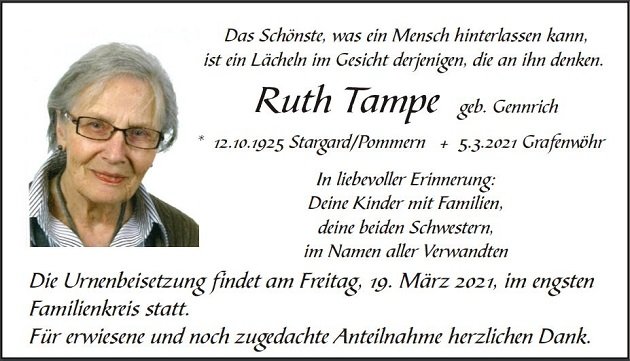 Traueranzeige Ruth Tampe, Grafenwöhr 13. März 2021, 06:46 Uhr Von: redaktion Traueranzeige Ruth Tampe, Grafenwöhr Landkreis Neustadt/WN Grafenwöhr