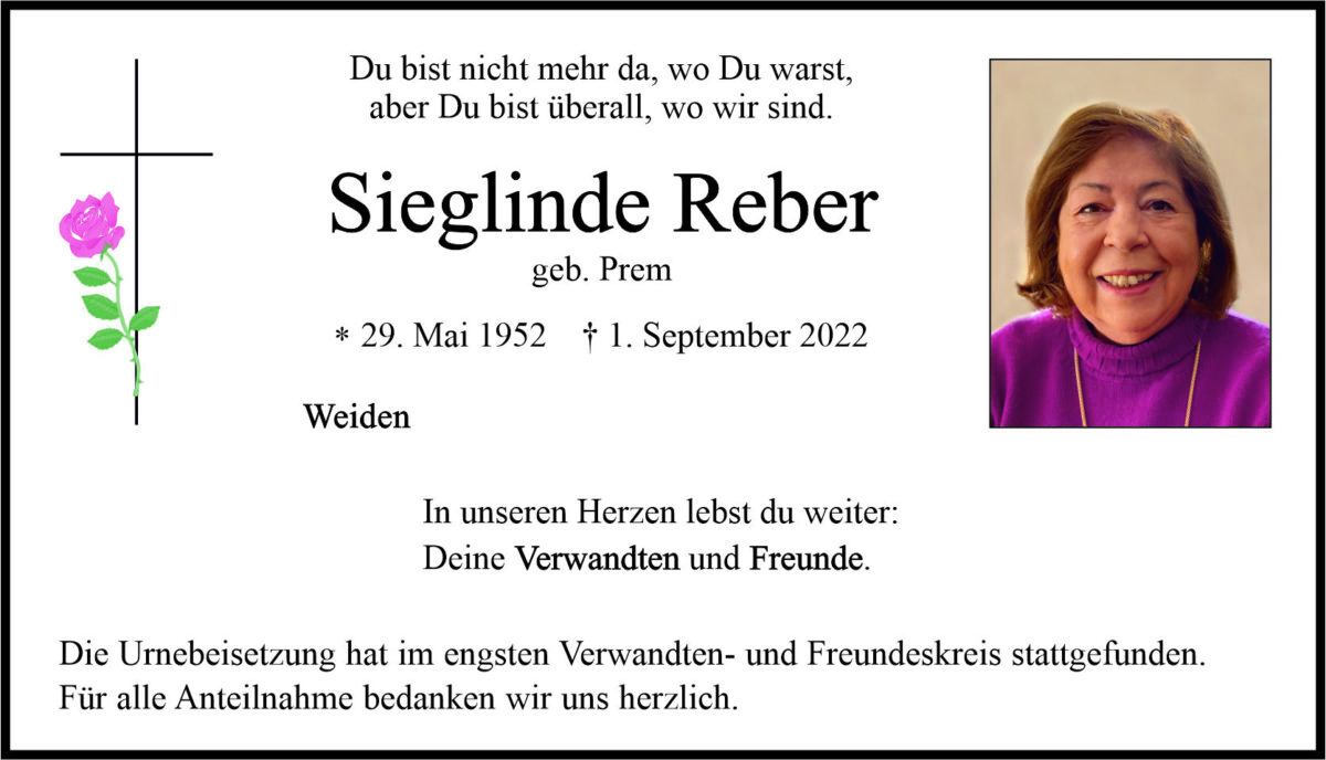 Traueranzeige Sieglinde Reber, Weiden 24. September 2022, 06:00 Uhr Von: redaktion Traueranzeige Sieglinde Reber, Weiden Stadtgebiete Weiden Weiden Stadt
