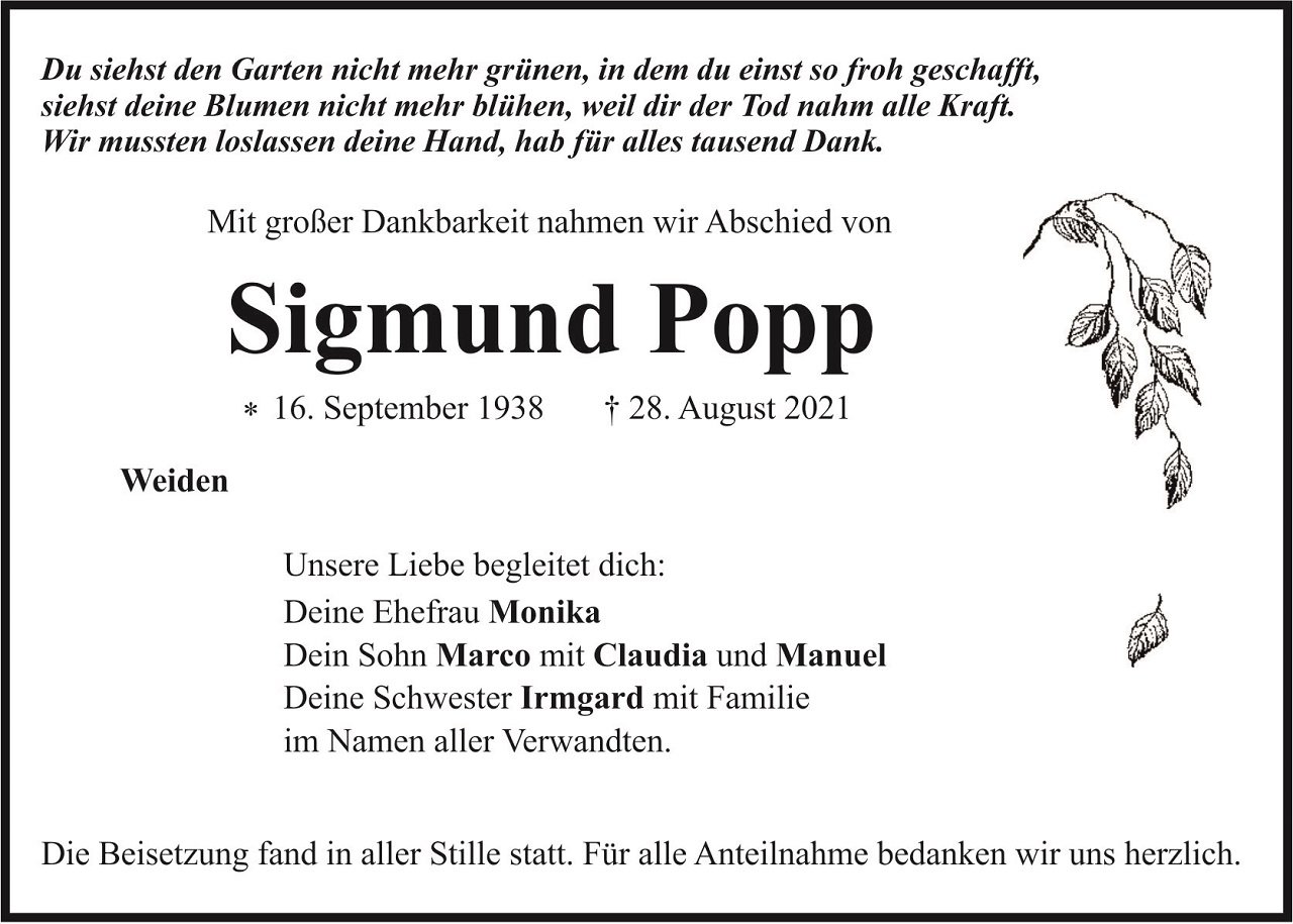 Traueranzeige Sigmund Popp, Weiden 11. September 2021, 04:00 Uhr Von: redaktion Traueranzeige Sigmund Popp, Weiden Stadtgebiete Weiden Weiden Stadt