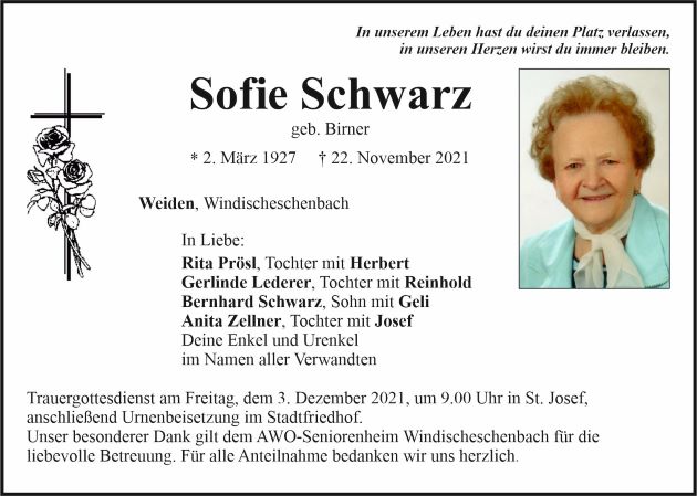 Traueranzeige Sofie Schwarz, Weiden 01. Dezember 2021, 05:00 Uhr Von: redaktion Traueranzeige Sofie Schwarz, Weiden Stadtgebiete Weiden Weiden Stadt
