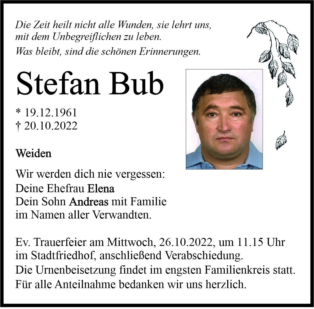 Traueranzeige Stefan Bub, Weiden 25. Oktober 2022, 06:00 Uhr Von: redaktion Traueranzeige Stefan Bub, Weiden Stadtgebiete Weiden Weiden Stadt