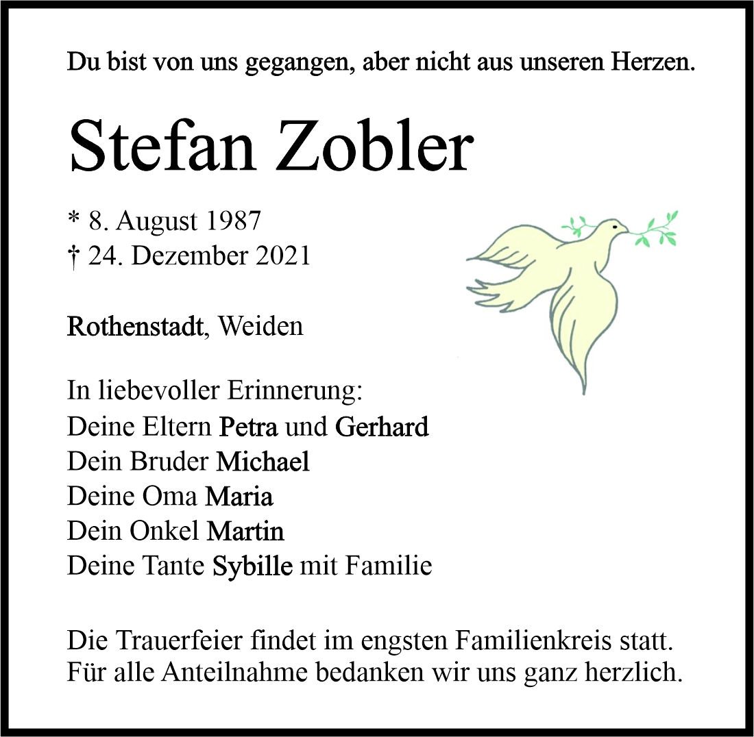 Traueranzeige Stefan Zobler, Rothenstadt 29. Dezember 2021, 05:00 Uhr Von: redaktion Traueranzeige Stefan Zobler, Rothenstadt Stadtgebiete Weiden Rothenstadt