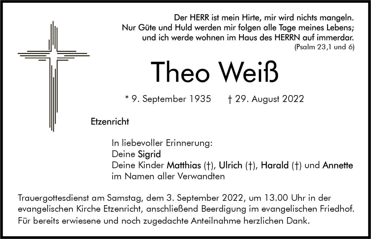 Traueranzeige Theo Weiß, Etzenricht 31. August 2022, 06:00 Uhr Von: redaktion Traueranzeige Theo Weiß, Etzenricht Landkreis Neustadt/WN Etzenricht