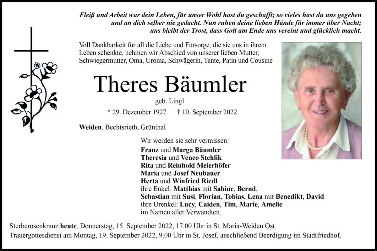 Traueranzeige Theres Bäumler, Weiden 15. September 2022, 06:00 Uhr Von: redaktion Traueranzeige Theres Bäumler, Weiden Landkreis Neustadt/WN Bechtsrieth Stadtgebiete Weiden Weiden Stadt