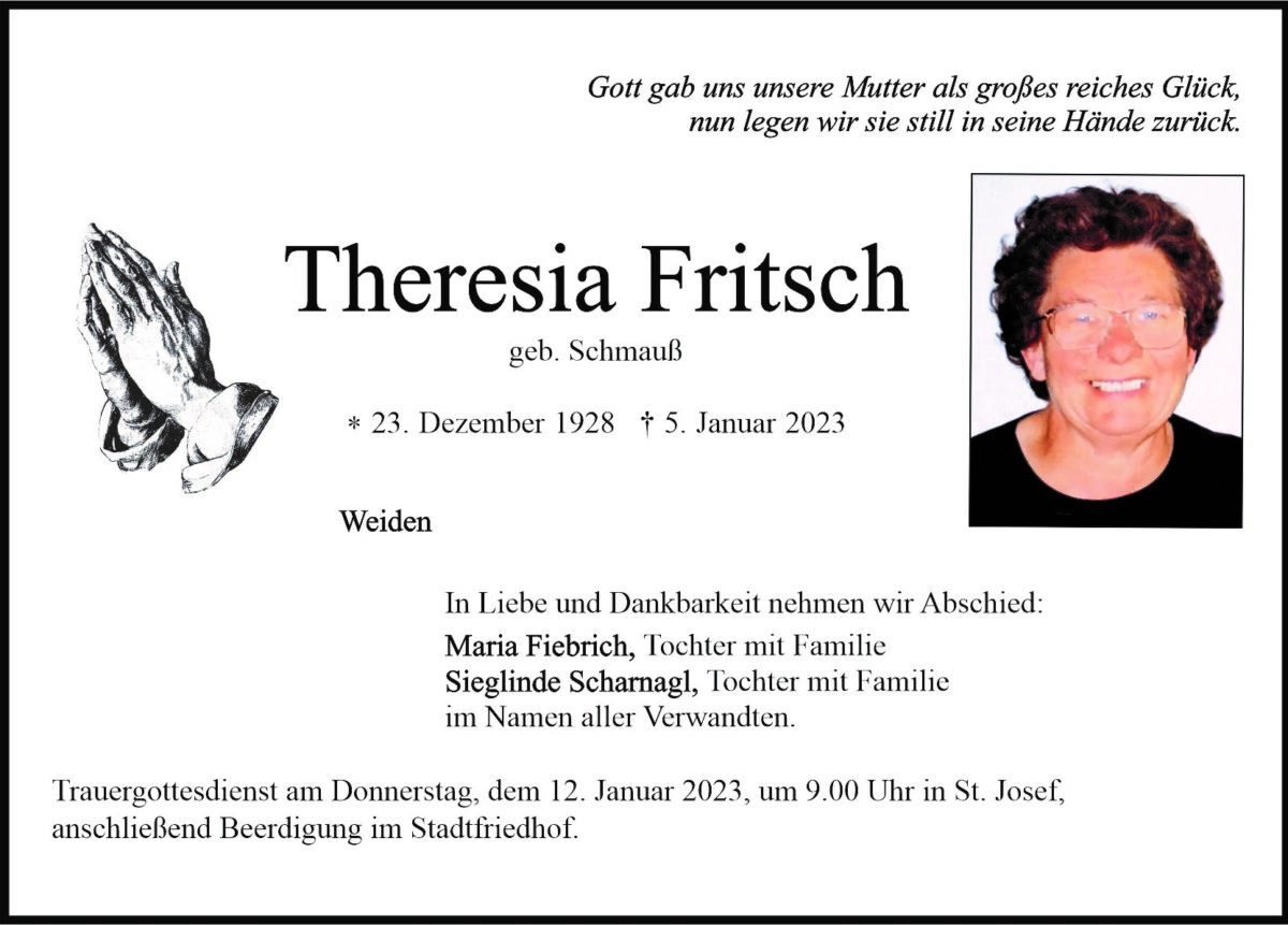 Traueranzeige Theresia Fritsch, Weiden 10. Januar 2023, 06:00 Uhr Von: redaktion Traueranzeige Theresia Fritsch, Weiden Stadtgebiete Weiden Weiden Stadt