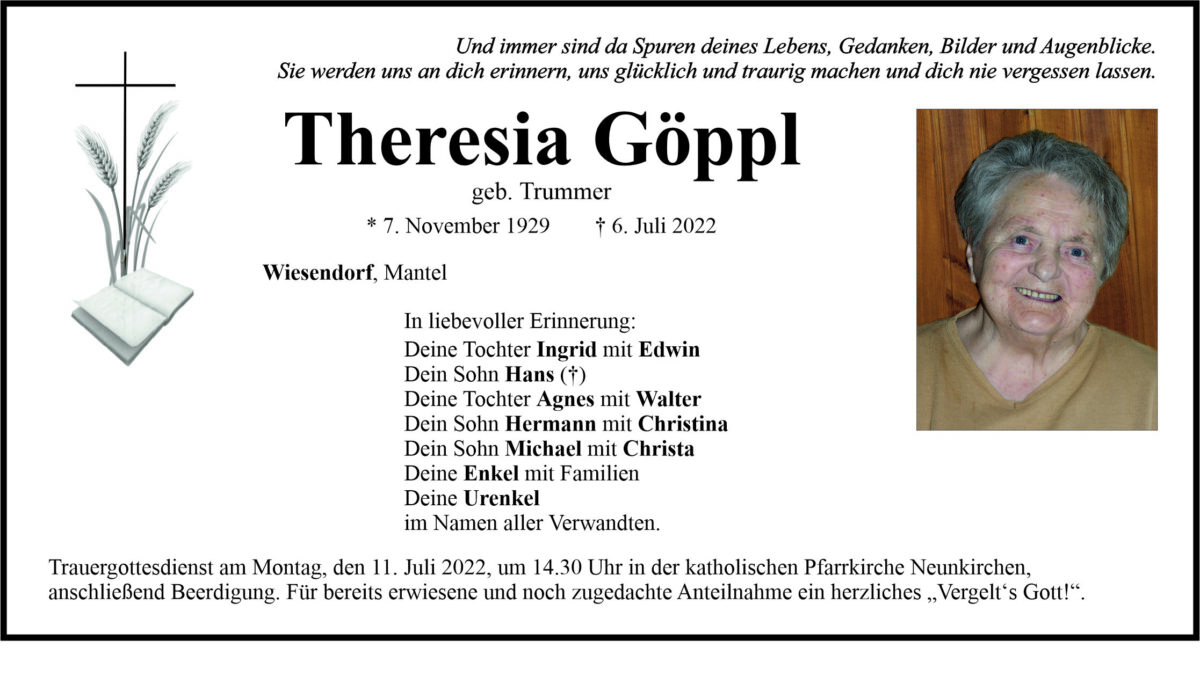 Traueranzeige Theresia Göppl, Wiesendorf 08. Juli 2022, 06:00 Uhr Von: redaktion Traueranzeige Theresia Göppl, Wiesendorf Landkreis Neustadt/WN Mantel Stadtgebiete Weiden Weiden Stadt