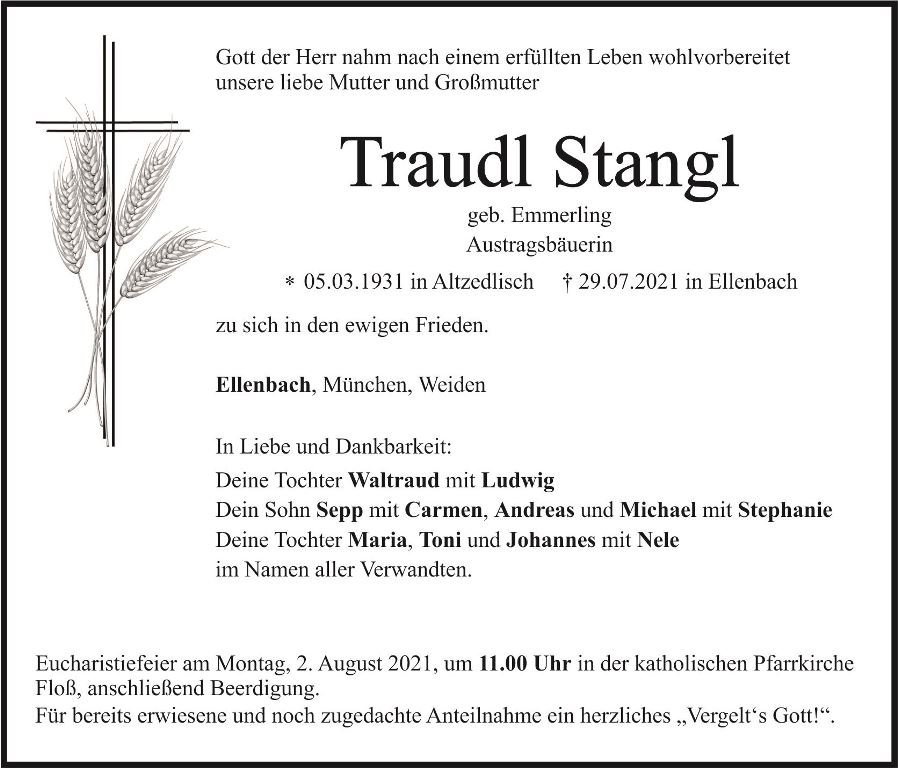 Traueranzeige Traudl Stangl, Ellenbach 31. Juli 2021, 04:00 Uhr Von: redaktion Traueranzeige Traudl Stangl, Ellenbach Landkreis Neustadt/WN Floß