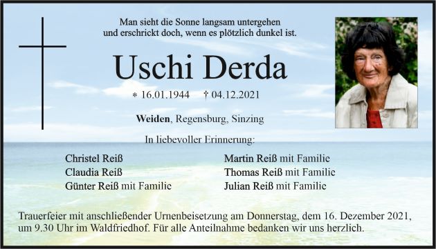 Traueranzeige Uschi Derda, Weiden 13. Dezember 2021, 06:30 Uhr Von: redaktion Traueranzeige Uschi Derda, Weiden Stadtgebiete Weiden Weiden Stadt
