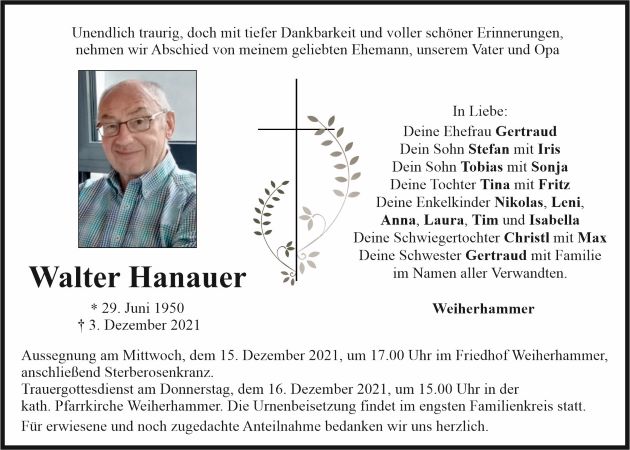Traueranzeige Walter Hanauer, Weiherhammer 13. Dezember 2021, 13:30 Uhr Von: redaktion Traueranzeige Walter Hanauer, Weiherhammer Landkreis Neustadt/WN Weiherhammer