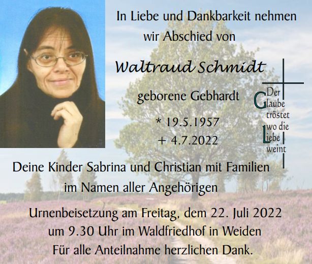 Traueranzeige Waltraud Schmidt, Weiden 20. Juli 2022, 06:00 Uhr Von: redaktion Traueranzeige Waltraud Schmidt, Weiden Stadtgebiete Weiden Weiden Stadt