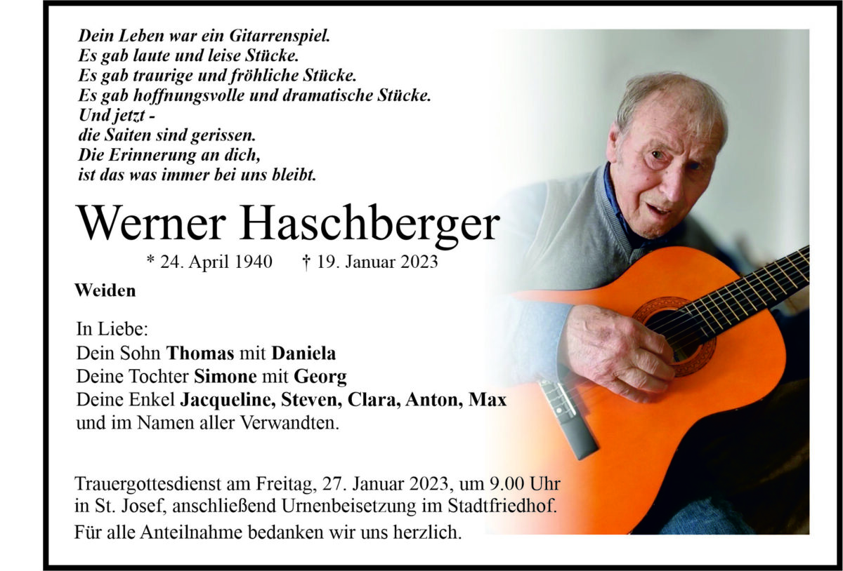 Traueranzeige Werner Haschberger, Weiden 21. Januar 2023, 06:00 Uhr Von: redaktion Traueranzeige Werner Haschberger, Weiden Stadtgebiete Weiden Weiden Stadt