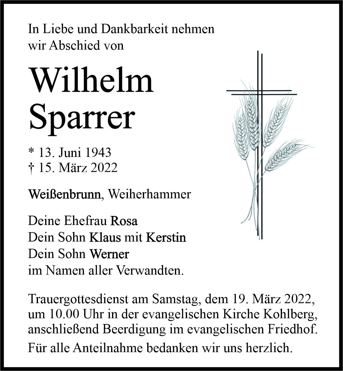 Traueranzeige Wilhelm Sparrer, Weißenbrunn 18. März 2022, 06:00 Uhr Von: redaktion Traueranzeige Wilhelm Sparrer, Weißenbrunn Landkreis Neustadt/WN Weiherhammer