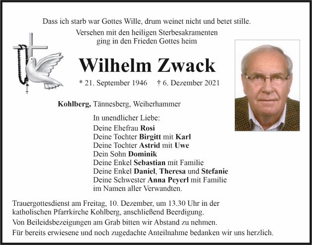 Traueranzeige Wilhelm Zwack, Kohlberg 08. Dezember 2021, 05:00 Uhr Von: redaktion Traueranzeige Wilhelm Zwack, Kohlberg Landkreis Neustadt/WN Kohlberg
