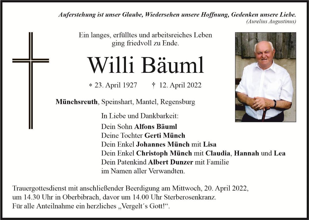 Traueranzeige Willi Bäuml, Münchsreuth 16. April 2022, 06:00 Uhr Von: Yvonne Fichtl Traueranzeige Willi Bäuml, Münchsreuth Landkreis Tirschenreuth Waldsassen