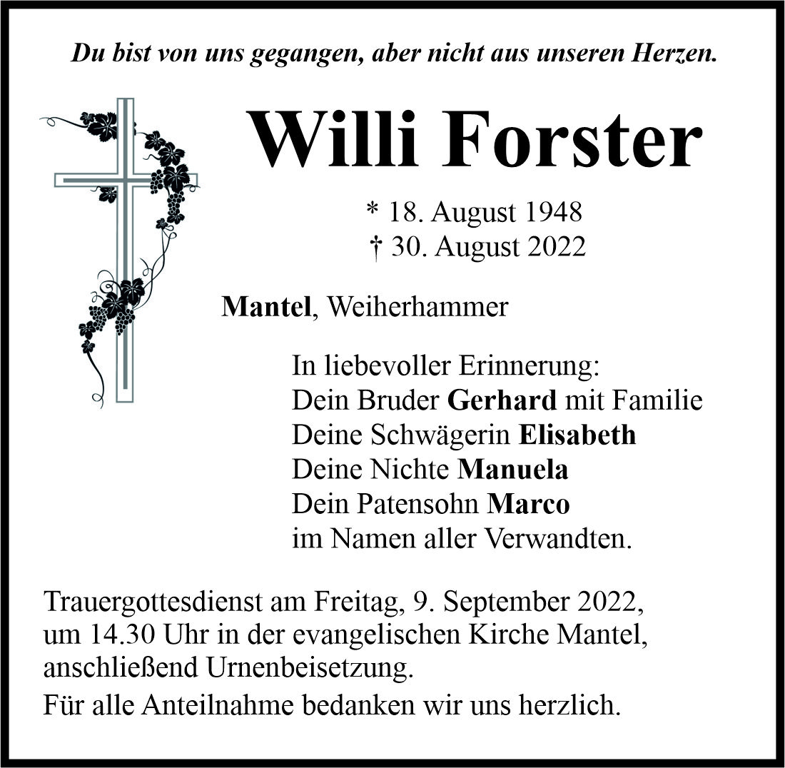 Traueranzeige Willi Forster, Mantel 07. September 2022, 06:00 Uhr Von: redaktion Traueranzeige Willi Forster, Mantel Landkreis Neustadt/WN Mantel Weiherhammer