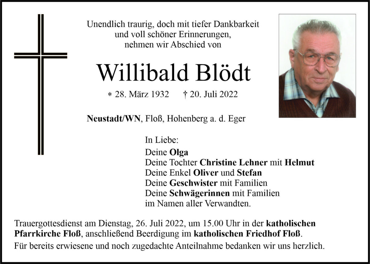 Traueranzeige Willibald Blödt, Neustadt/WN 22. Juli 2022, 06:00 Uhr Von: redaktion Traueranzeige Willibald Blödt, Neustadt/WN Landkreis Neustadt/WN Floß Neustadt/WN