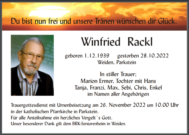 Traueranzeige Winfried Rackl, Weiden 19. November 2022, 06:00 Uhr Von: redaktion Traueranzeige Winfried Rackl, Weiden Landkreis Neustadt/WN Parkstein Stadtgebiete Weiden Weiden Stadt