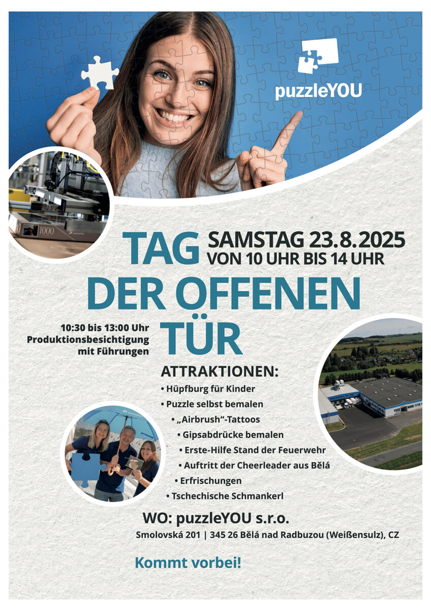Am 23. August lädt puzzleYOU zum Tag der offenen Tür von 10 bis 14 Uhr in sein Werk in B?lá nad Radbuzou im Plze?ský kraj, etwa zehn Kilometer östlich des bayerischen Marktes Eslarn im Okres Domažlice ein.