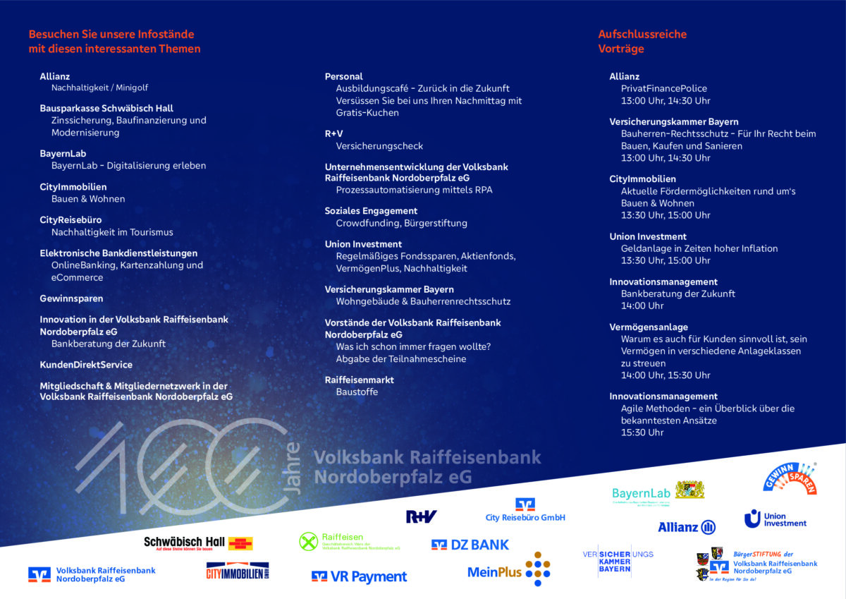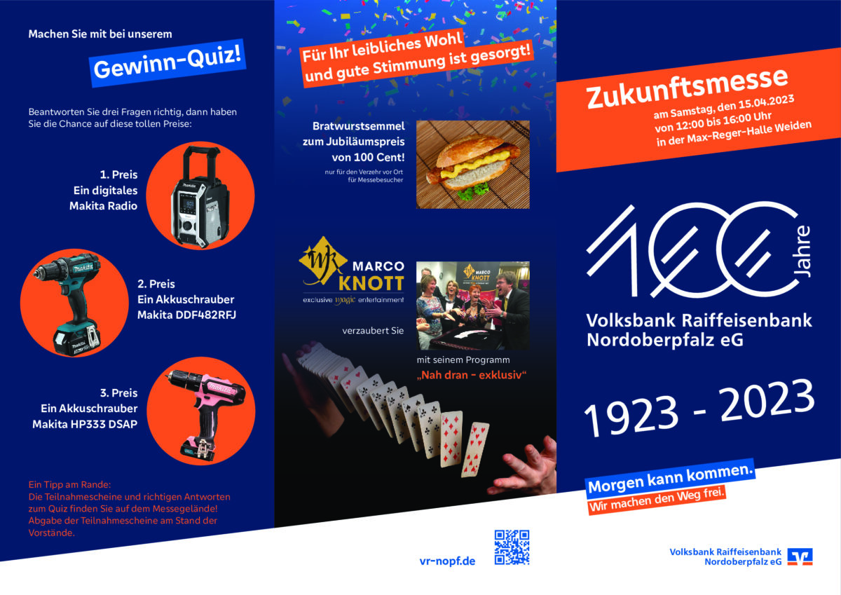 Unter dem Motto „Was ich schon immer fragen wollte?“ steht der vierköpfige Bankvorstand dem Publikum Rede und Antwort. Mit ein bisschen Glück kann man beim Gewinnspiel interessante Preise einheimsen. Es winken ein duales Radio und Akkuschrauber von Makita. Auch für das leibliche Wohl der Messebesucher ist bestens gesorgt. Passend zum runden Geburtstag kostet eine leckere Bratwurstsemmel nur 100 Cent.