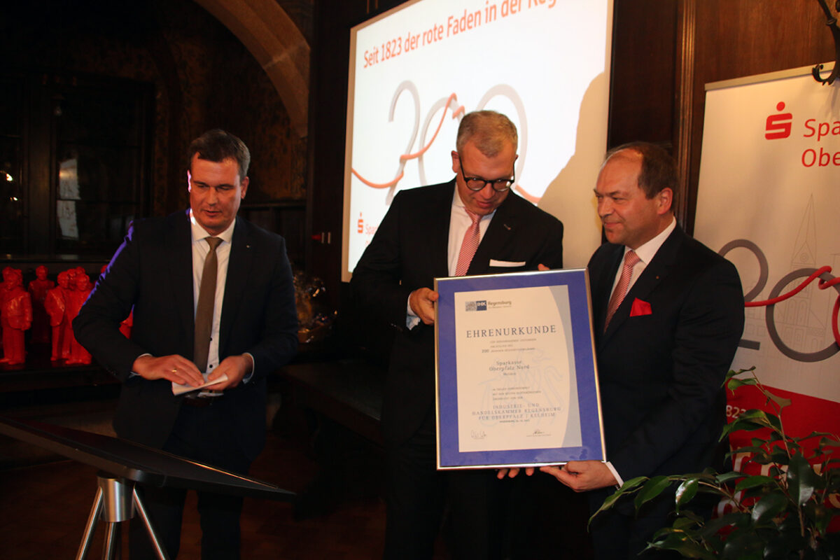 Stellvertretend für die regionale Wirtschaft überreicht Florian Rieder, Leiter der IHK-Geschäftsstelle Nordoberpfalz, eine Ehrenurkunde: „Ihre Trägerschaft durch die Kommunen, ihre Gemeinwohlverpflichtung und ihre Regionalität zeichnet die Sparkasse aus“, lobt Rieder. „Die deutsche Wirtschaft besticht auch durch die Vielfalt der Wirtschaftsregionen, die in ihrer Mehrheit durch kleine und mittelständische Unternehmen geprägt sind – sie haben in der Sparkasse einen verlässlichen Partner, der zugleich ein Seismograf für die wirtschaftliche Entwicklung ist.“