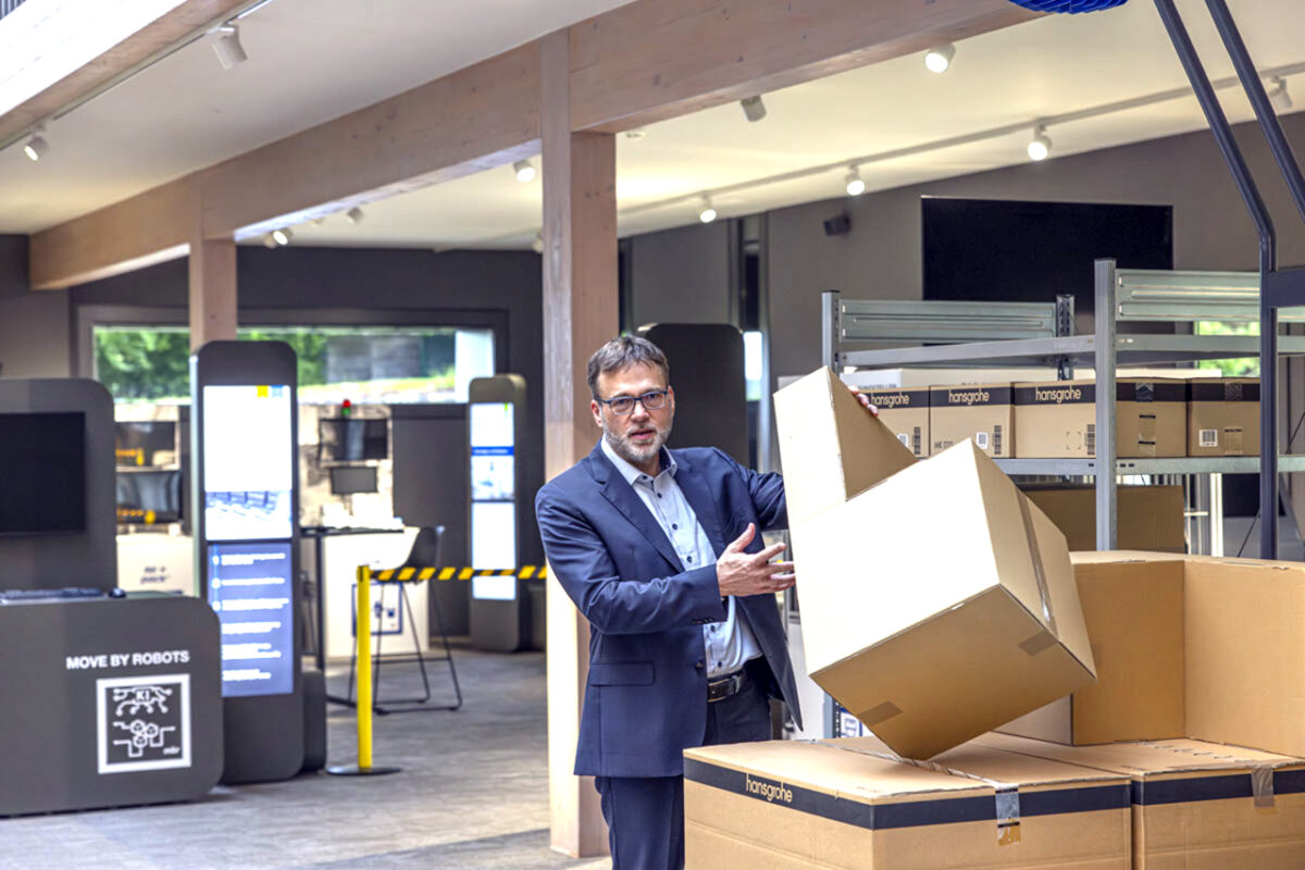 Andreas Spangler: Nehmen wir an, Sie wollen auf einer Palette Kartons so schlichten, dass möglichst wenig Luft dazwischen ist, damit der Raum in einem Container bestmöglich ausgenutzt werden kann. Unsere Kameratechnik beobachtet den Werker und leitet ihn an. Es kann passieren, wenn der Hawk auf einen erfahrenen Mitarbeiter trifft, dass der im Einzelfall feststellt: „Das kann ich noch besser schlichten.“ Hawk prüft dann wie mit einem Navigationssystem, ob das stimmt, und wenn ja, passt er das restliche Schlichtmuster entsprechend an. Solche Lernphasen kommen vor allem vor, wenn wir neue Artikel haben und die Verpackung verändert wurde.