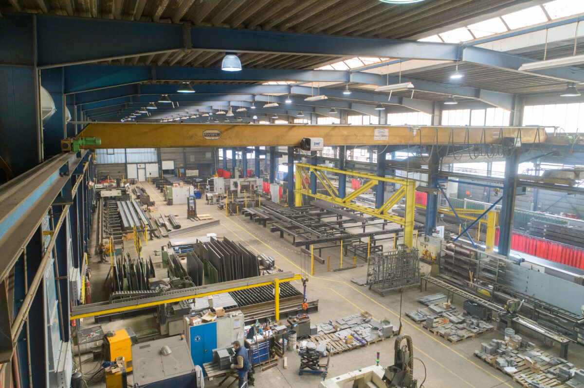 In der großen Produktionshalle in Weiden wird „schwarzer“ Stahl bearbeitet: gestrahlt, gesägt, geschweißt und lackiert. Zum Einsatz kommt der Stahl im schlüsselfertigen Hallenbau, Industriestahlbau, bei der Fördertechnik, architektonischen Stahlobjekten oder für Treppen, Geländer und Balkone.