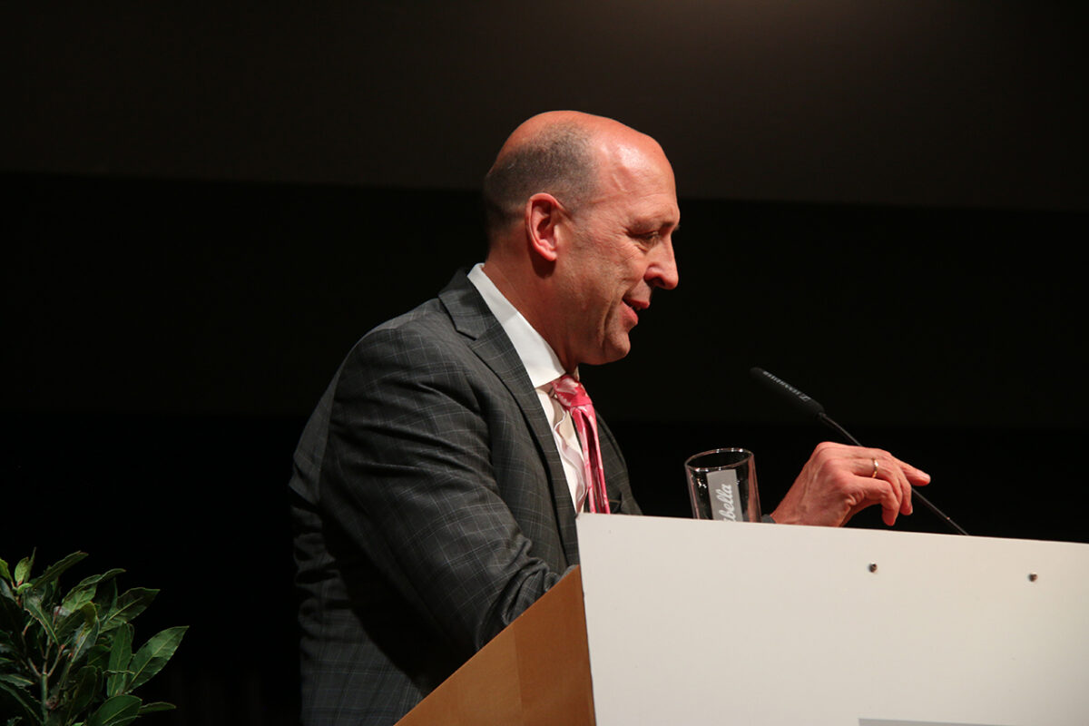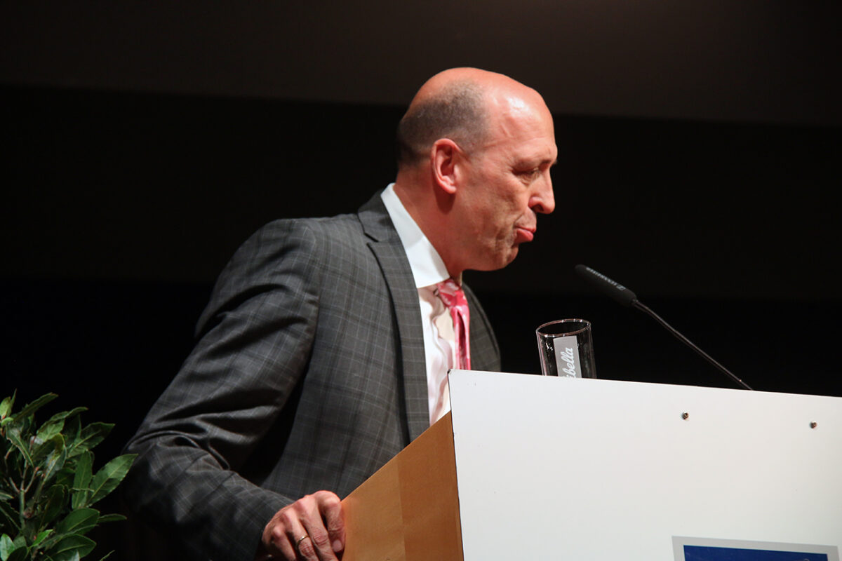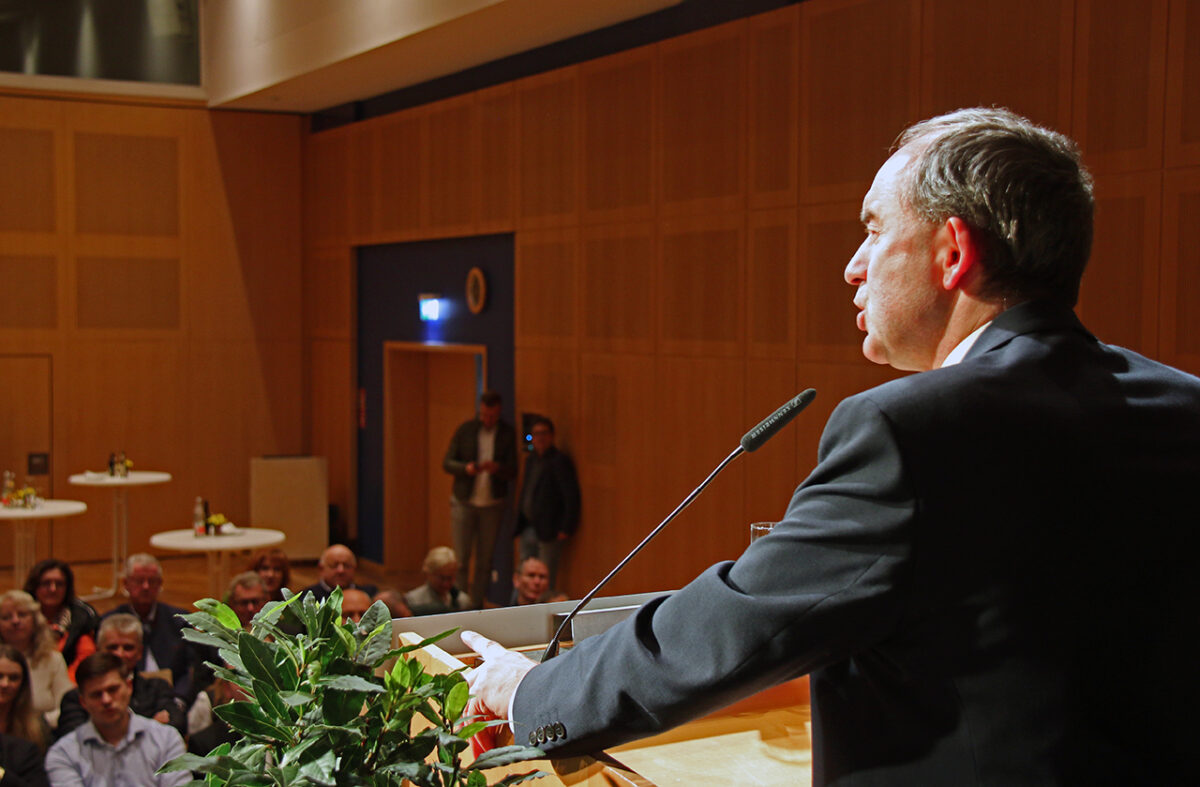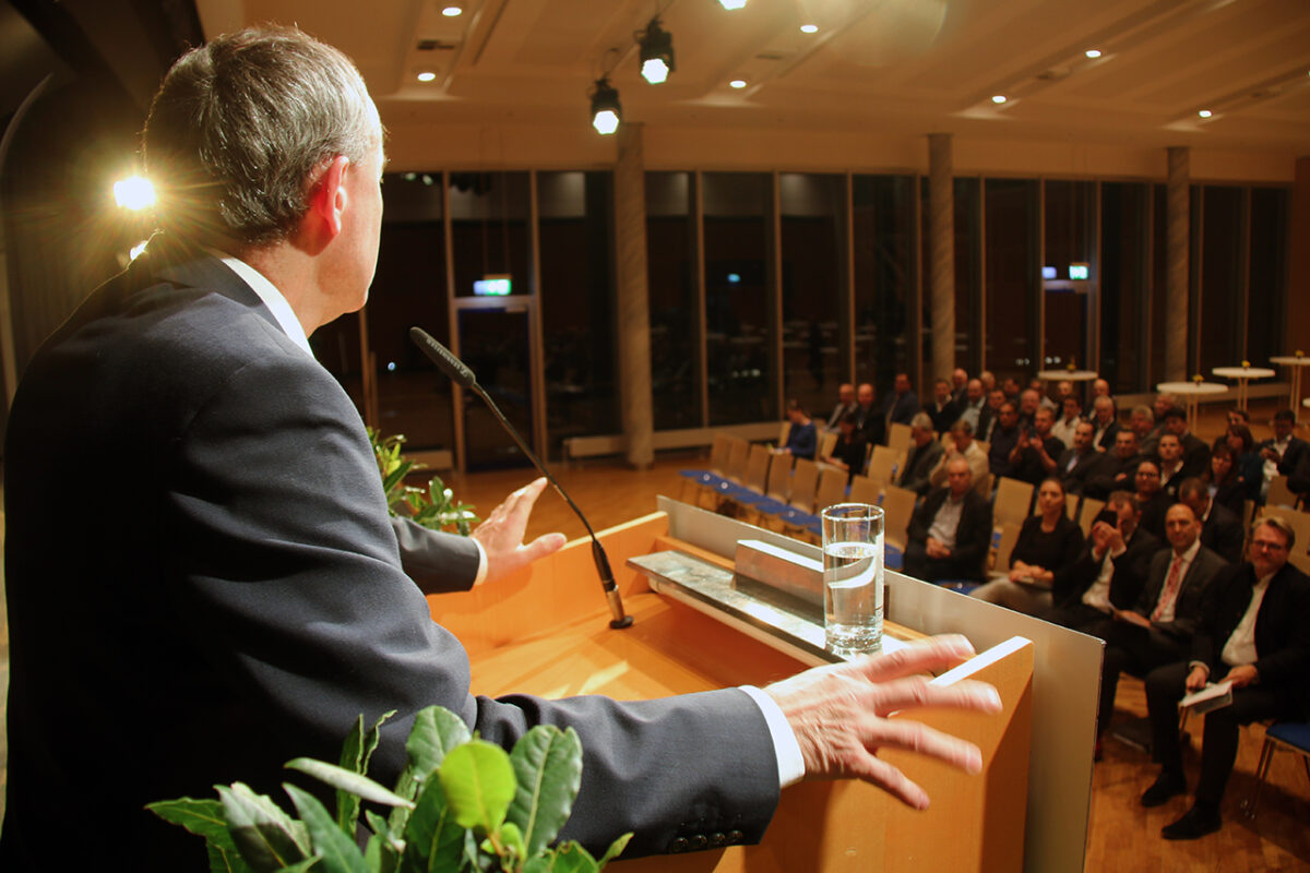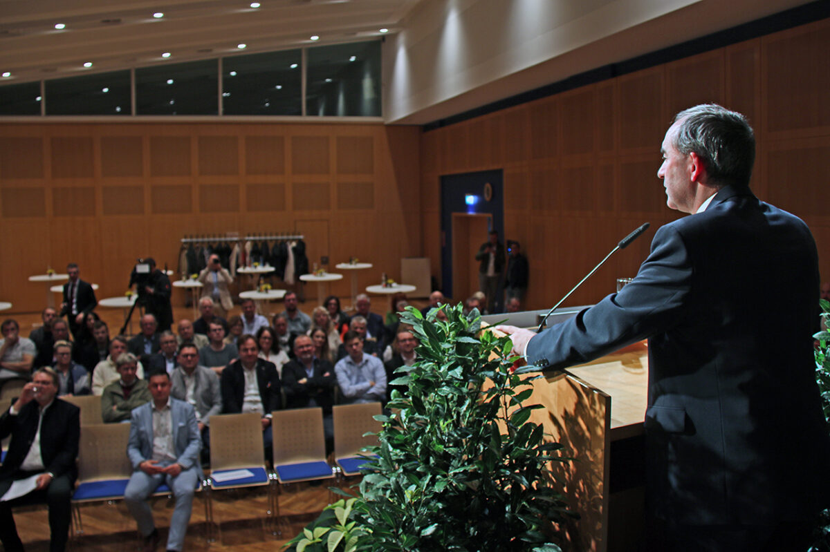 Man müsse mit den Kosten in allen Bereichen – Energie, Arbeit, Umweltauflagen, Bürokratie – runter und dann die Chancen vor Ort nutzen. „Wir brauchen nicht alle Dokumentationen dieser Welt, um Ihnen als Unternehmer auf die Finger zu schauen.“ Man könne jetzt die Chance der Krise nutzen: „Wie ein Betrieb, der vor der Insolvenz steht, der muss sich durchleuchten, eine strikte Kostenanalyse machen – wir sind als Staat Diener der Wirtschaft, nicht Sie unsere Büttel.“ Ein Staat brauche eine stabile Wirtschaft. „Danke, dass sie trotz aller Schwierigkeiten dem Standort treu bleiben.“ Apropos: „Die Erbschaftssteuer gehört sich längst abgeschafft.“ Denn: „Sie sind der Mittelpunkt“, flirtet der Minister, „da lulle ich Sie nicht ein.“