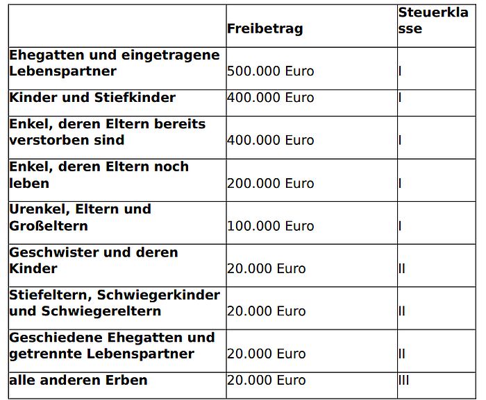 Freibeträge und Steuerklassen bei einer Erbschaft/Schenkung gem. §§ 15, 16 Erbschafts- und Schenkungssteuergesetz: