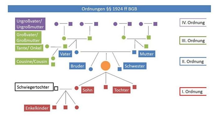 Ohne Testament richtet sich die Verteilung des Erbes nach den Vorschriften des Bürgerlichen Gesetzbuches (BGB, §§ 1922-2385). Es wird nach sogenannten Ordnungen und Stämmen unterschieden.