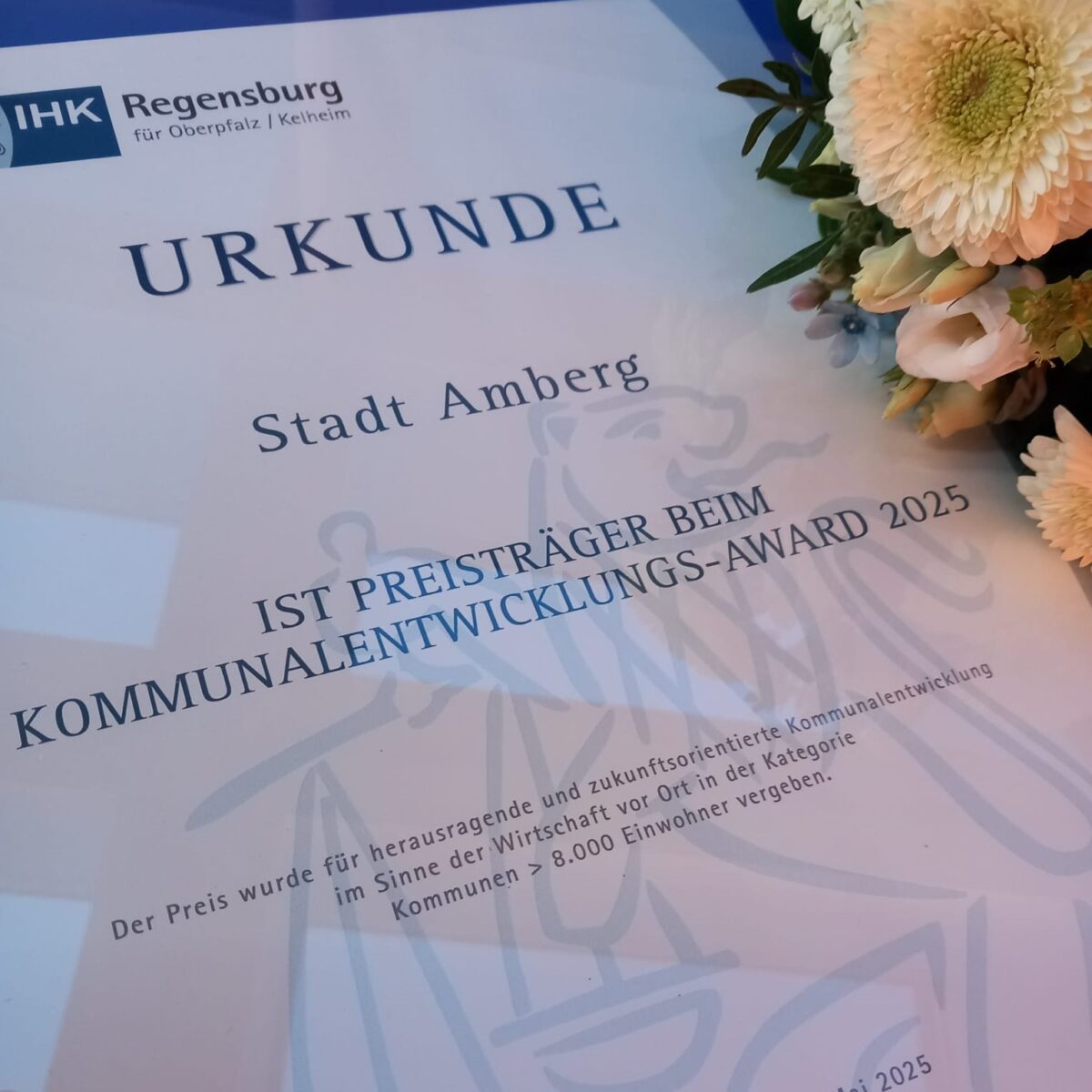 Amberg, die Stadt an der Vils, feiert einen großen Erfolg. Ihr innovatives Bürgerbeteiligungsprojekt „Innenstadt-Million“ überzeugte die Jury und brachte ihr den Sieg beim IHK-Kommunalentwicklungsaward 2025. Dieser Preis zeichnet herausragende und zukunftsorientierte Kommunalentwicklung im Sinne der Wirtschaft vor Ort aus. Eine Delegation um den zweiten Bürgermeister Martin J. Preuß, nahm die Auszeichnung voller Stolz in Regensburg entgegen.