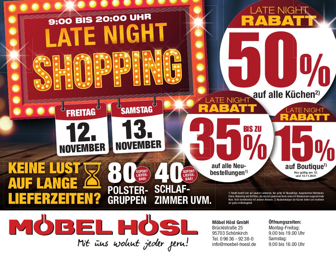 Am 12. und 13. November gibt es bei Möbel Hösl in Schönkirch wieder einiges zu entdecken, denn das Einrichtungshaus veranstaltet wie jedes Jahr das beliebte Late Night Shopping – mit verlängerten Öffnungszeiten bis 20:00 Uhr.