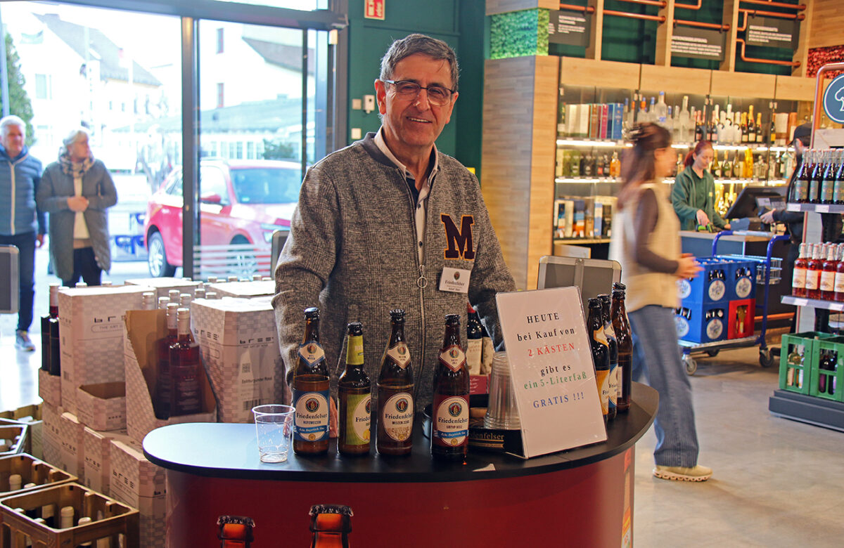 Ja, gibt’s denn heit scho was g‘schenkt? A bissl was geht immer: Adolf Heib, der für die Schlossbrauerei Friedenfels das Urtyp Hell, Radler, Hefe-Weizen oder die Eigenkreation Weizen-Zoigl zum Probieren anbietet, gibt den Kunden beim Kauf zweier Kästen ein 5-Liter Fass mit auf den Weg. „Ich bin das erste Mal hier“, sagt der Waldershofer, „ich finde das Ambiente total schön.“