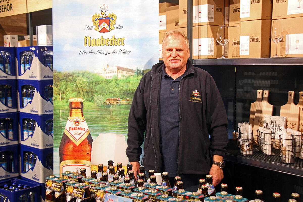 Gleich rechts vom Eingang hat sich Gerhard Graf mit seiner Auswahl an Naabecker breit gemacht. „Heute war schon viel Andrang“, sagt der Schwarzenfelder, „seit ich heute um 8.30 Uhr aufgebaut habe, sind vielleicht 15 Kästen rausgegangen. Er ist mit den Bieren der Schwandorfer Schlossbrauerei nur noch am Samstag vertreten.