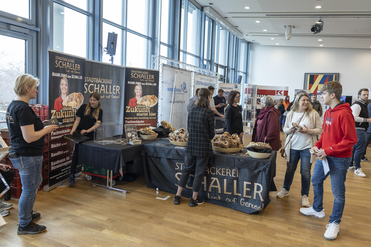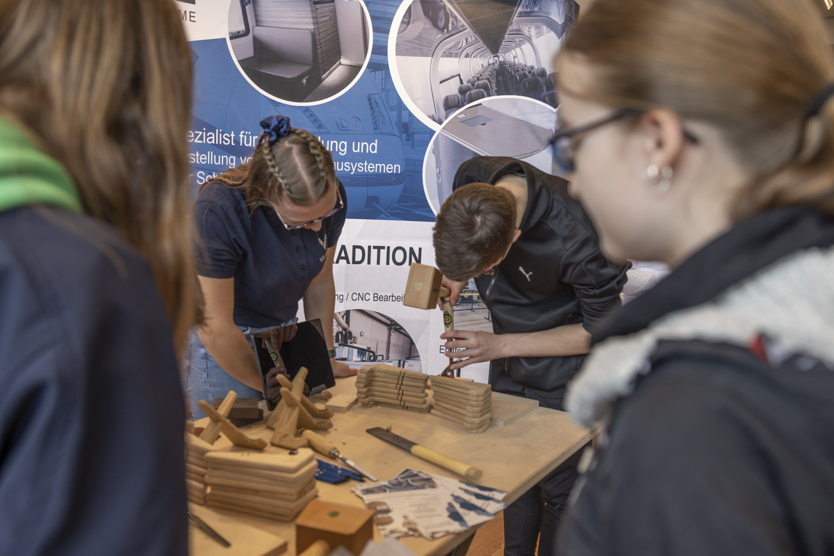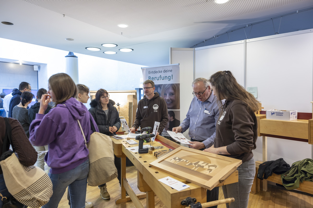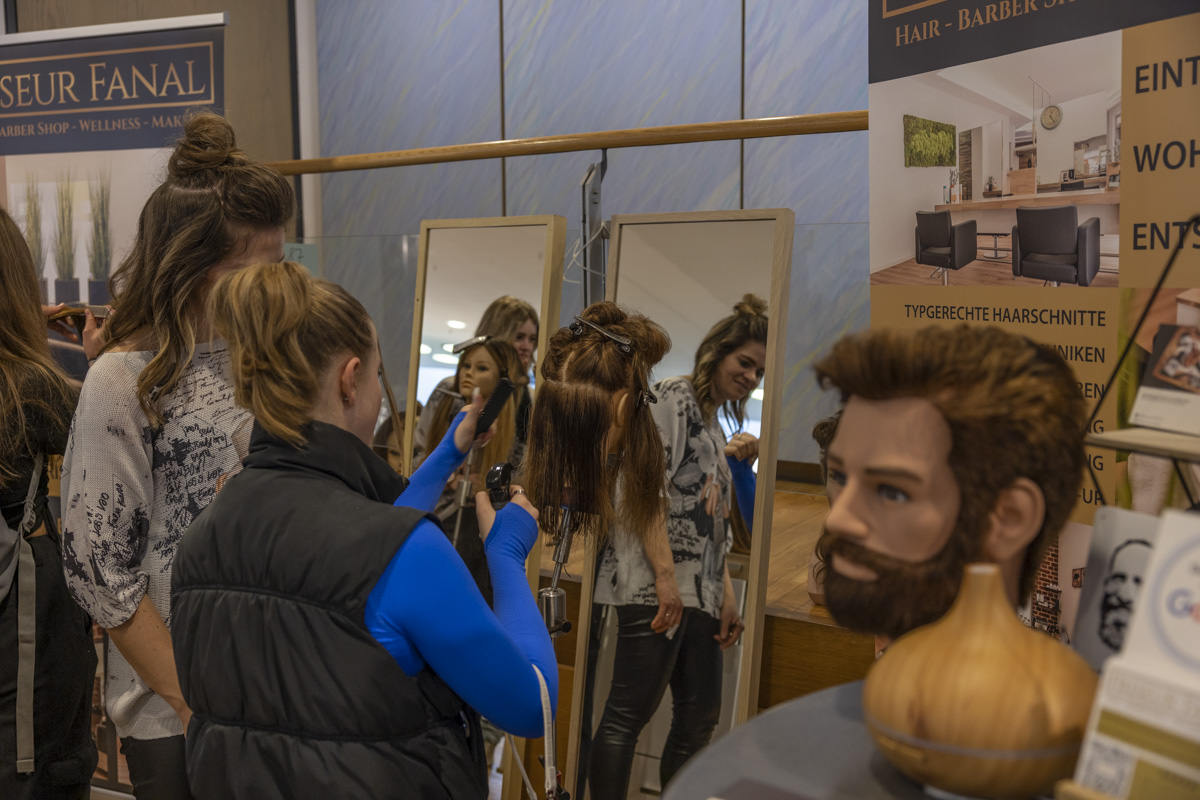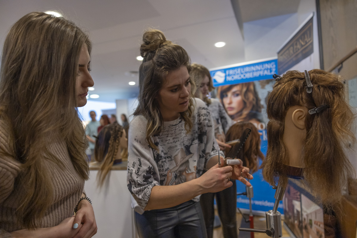 Neben der Möglichkeit, sich ausführlich über das Ausbildungsangebot zu informieren und direkt mit Vertretern der Unternehmen in Kontakt zu treten, konnten die Besucher auch selbst in verschiedene Berufsfelder eintauchen. Interessierte durften Haare stylen und schneiden, Holzwerkstücke bearbeiten, Maschinen bedienen oder in die digitale Welt abtauchen. Bei der Ausbildungsmesse war alles möglich. Eine große Fülle an Informationsmaterialien und nicht wenige Werbegeschenke rundeten das Messeerlebnis ab.